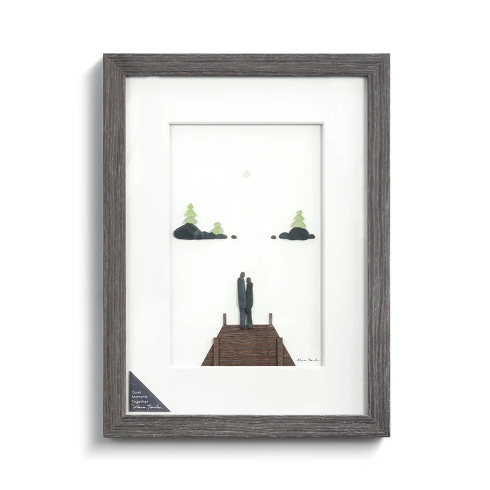 The Quiet Moments Together Wall Art depicts a couple looking out from a dock on a seascape. Great for gifting to couples who cherish their quiet moments together, a partner you want to show how you feel, or someone with a beach themed home. The Sharon Nowlan collection celebrates the beautiful in life through evocative beach pebble-inspired artwork.